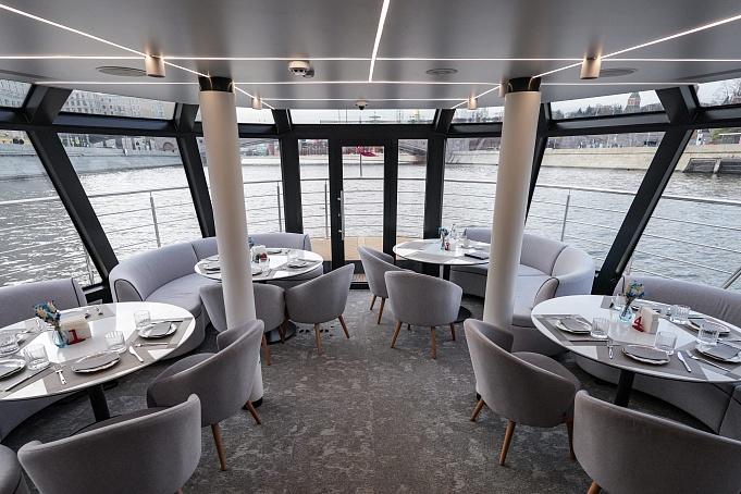 Инновационное электросудно «Стрельна» имеет ледовый класс и продолжает навигацию круглый год. Внутри салона поддерживается комфортная температура, а панорамное остекление позволяет любоваться заснеженной Москвой в тепле и уюте даже в зимние морозы. -