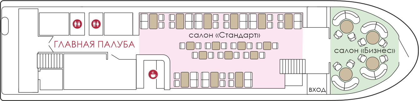на 24 гостей. Четыре стола на шесть персон с лучшим панорамным обзором, отдельный выход на носовую прогулочную палубу.