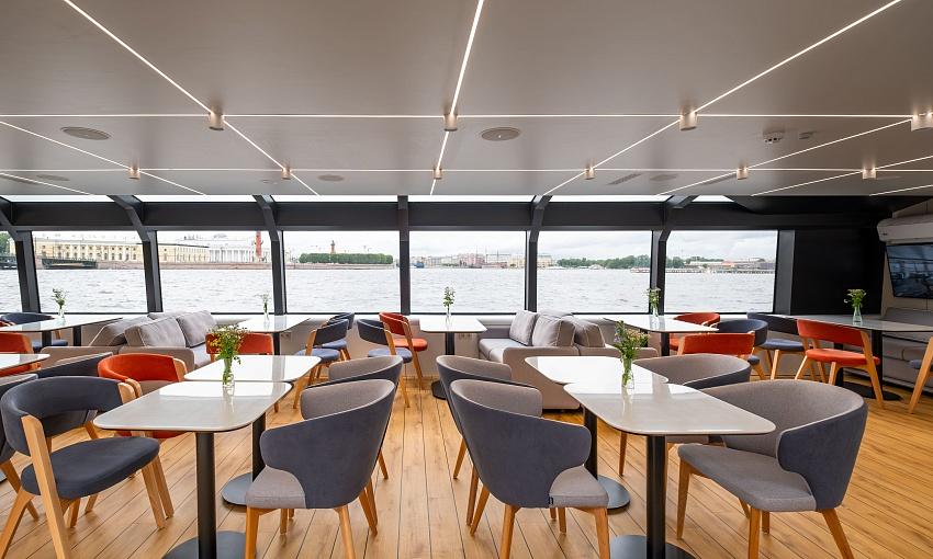 На борту электрохода «Стрельна» открыт полноценный ресторан, где каждый рейс превращается в гастрономическое путешествие по Москве-реке.