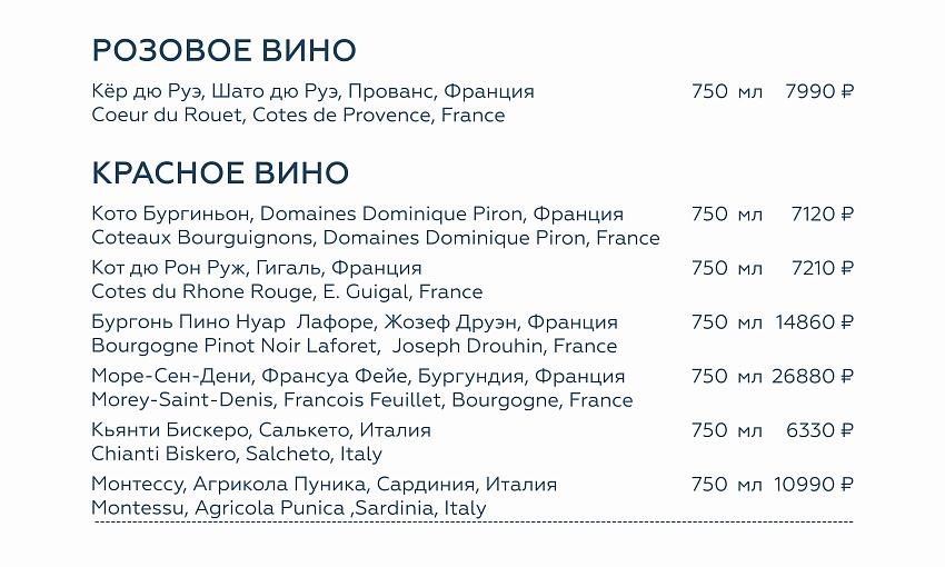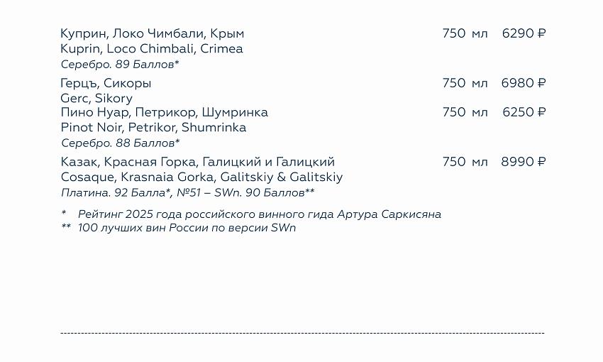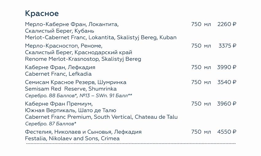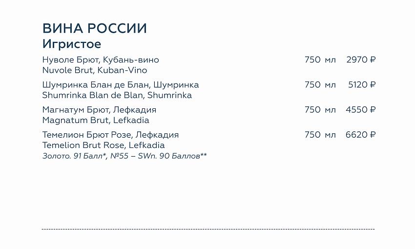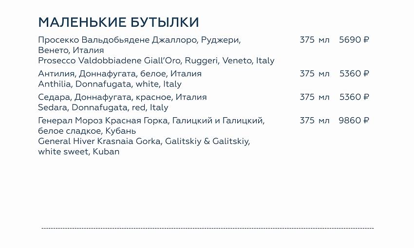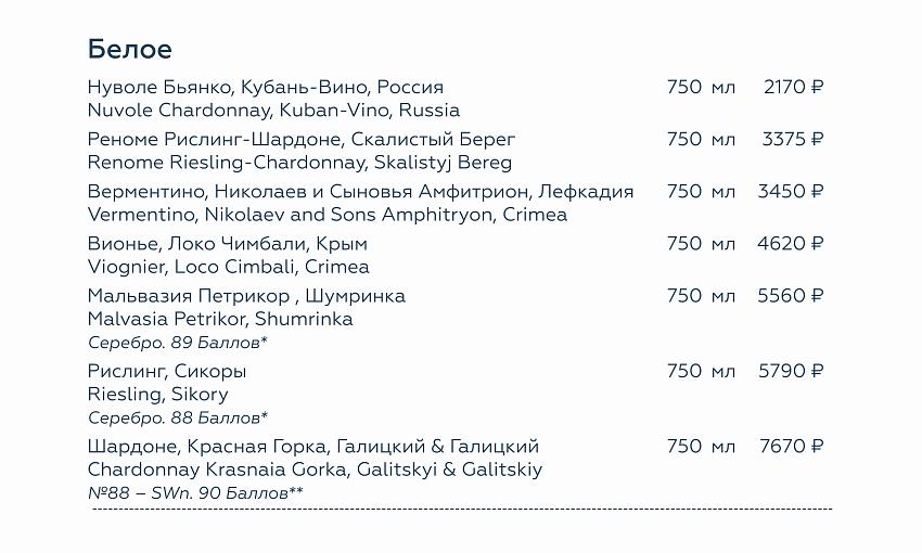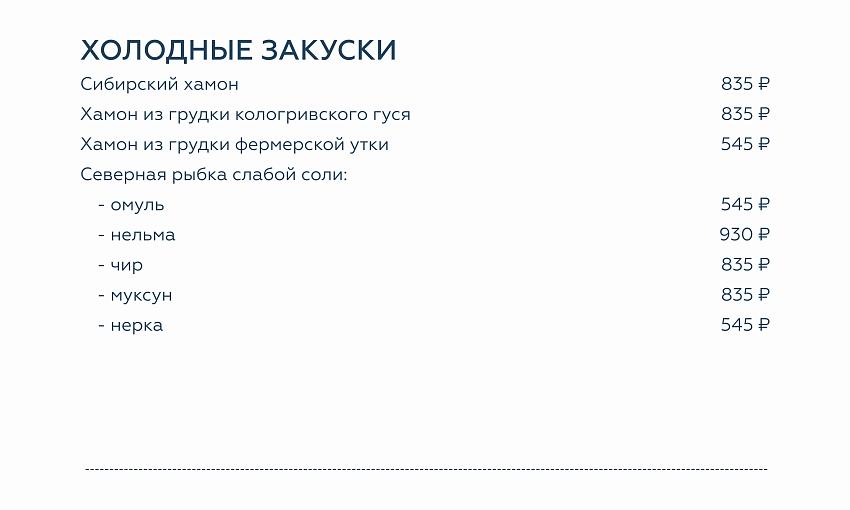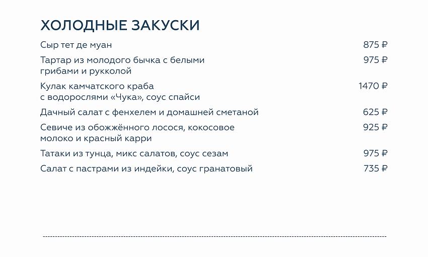 - Снеки и холодные закуски: хамон из утки, северную рыбку слабой соли, тартар молодого бычка с белыми грибами, кулак камчатского краба.