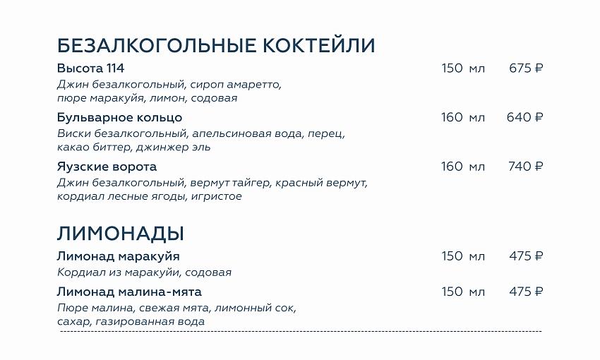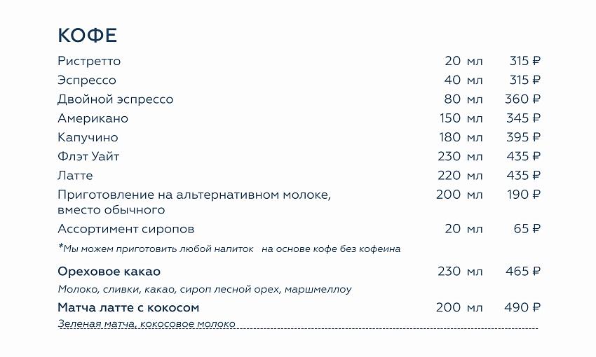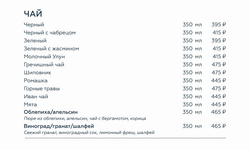 - Напитки: авторские чаи, кофе, лимонады, коктейли
