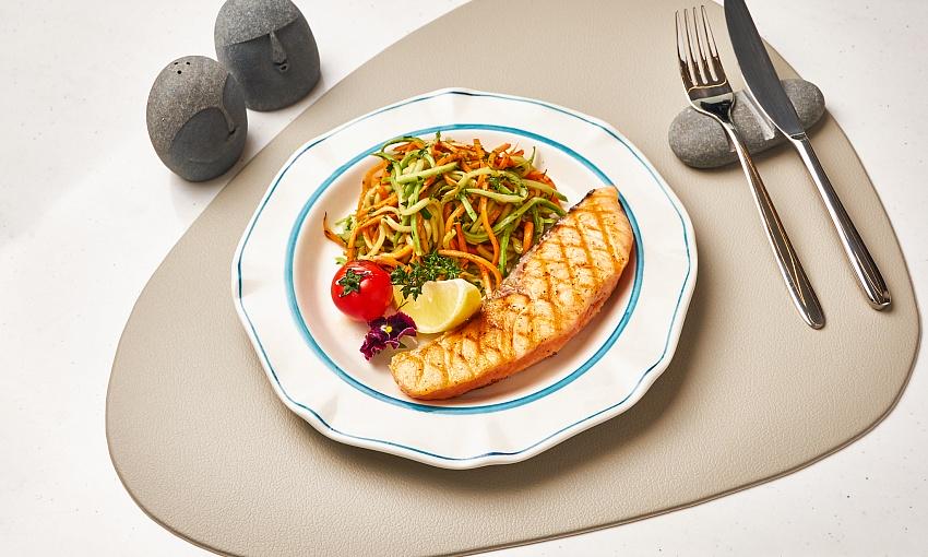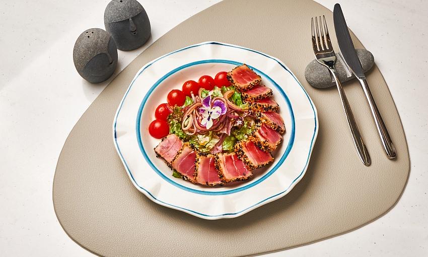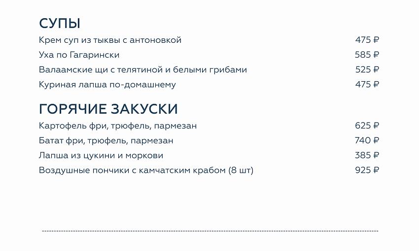 - Салаты и супы: севиче из лосося, татаки из тунца, уху по-Гагарински, крем-суп из тыквы с антоновкой.