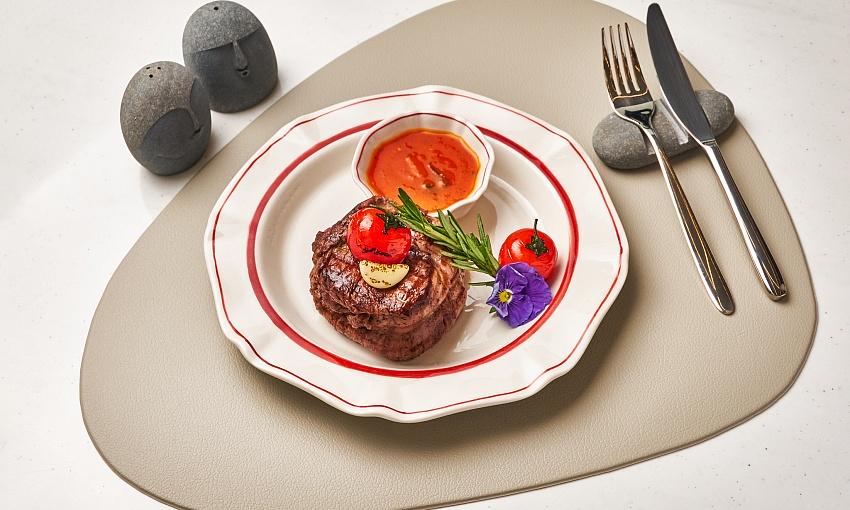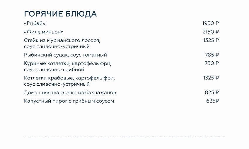 - Горячие блюда: рибай, филе-миньон, судака с томатным соусом, крабовые котлетки, домашнюю «шарлотку» из баклажанов.