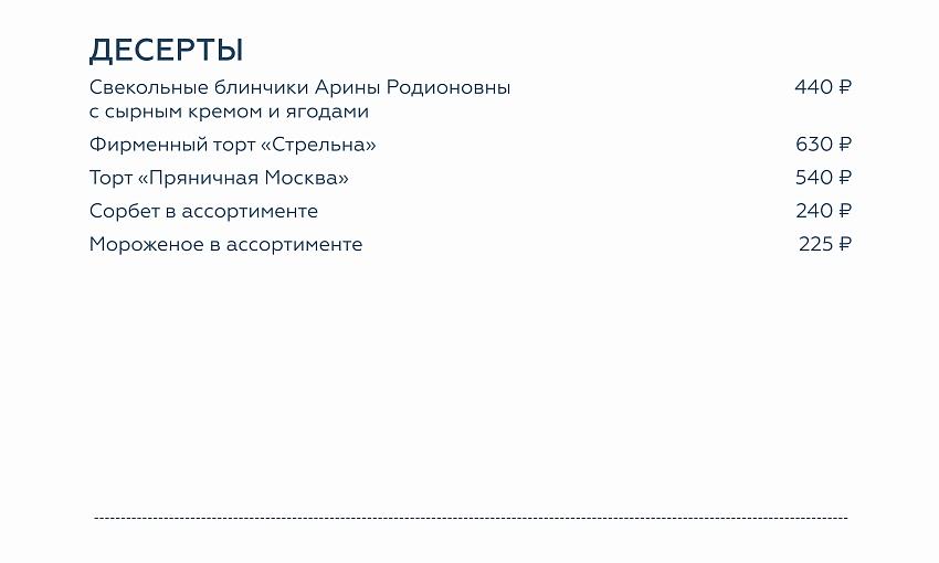 - Десерты: фирменный торт «Стрельна», «Пряничная Москва», свекольные блинчики — по тому самому рецепту няни Пушкина.
