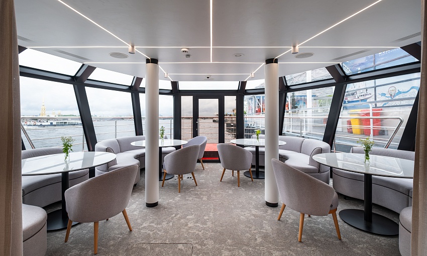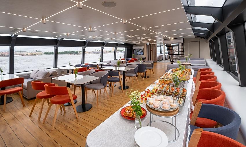 На борту электрохода расположен ресторан с авторской кухней и баром, а также четыре уникальных салона: